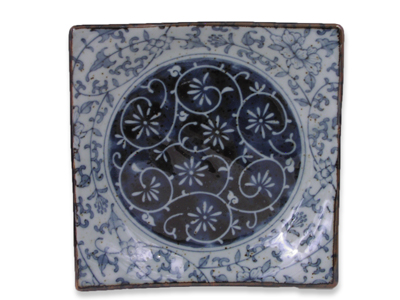 Rustic Dark Green, Blue, and Cream Karakusa Collection highlights the diversity and beauty of the traditional pattern. This Square Japanese Plate actually features the Karakusa in two different motifs. The first a swirling, interconnected pattern reminiscent of traditional Japanese ceramicware and the second a more detailed approach. Purchase this plate in