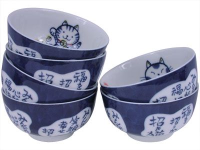 With six beautifully glazed rice bowl in a lovely deep blue featuring Japanese hiragana characters in a charming poem that says: “Everyone’s smiling face is happy. Luck Bringer—Maneki Neko. Smile at the Door, for fortune is coming.”