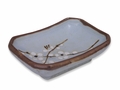 Cherry Blossom Collection, this lovely little cherry blossom plate showcases a design of intertwining brown branches, with cherry blossom flowers and buds growing from them. This design is embossed on a pale jade color which is contrasted by a dark brown rim. This wonderful ceramic Japanese plate takes on a square shape with cropped corners, adding to its already unique charm.