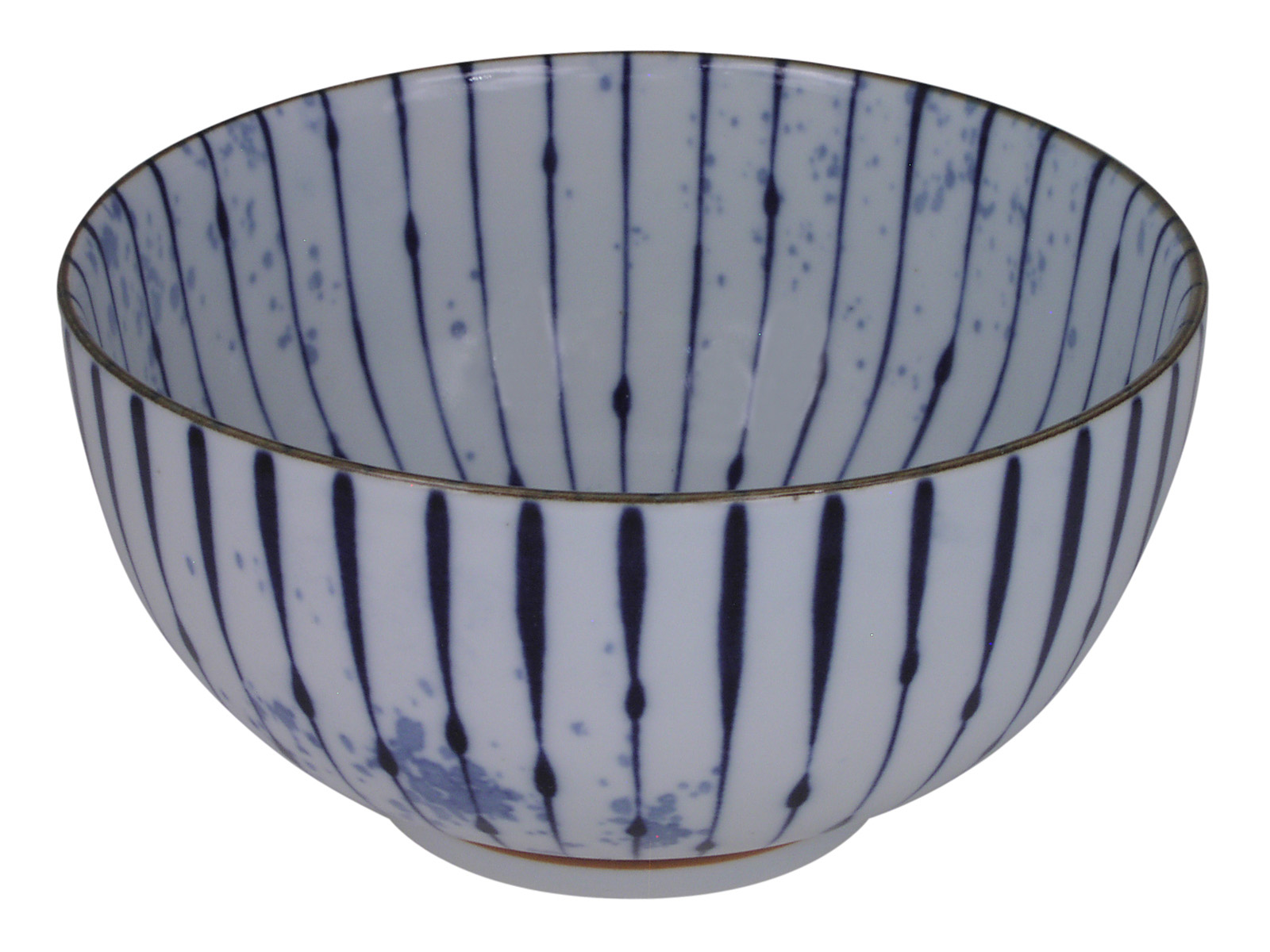 An elegent representation of beauty in asymmetry, these artfully printed Japanese ceramic donburi bowls will stand out as works of art on your table! With a white underglaze spackled in light blue and covered in prints of imperfect blue lines, these donburi bowls are excellent representations of Japanese wabi-sabi, or beautiful imperfection. Donburi is a Japanese dish consisting of a bed of rice topped with savory and delicious cuts of meat or vegetables, and this staple dish will begin to frequently find its way on your table once you have these beautiful dishes.