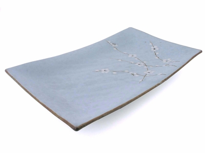 Any entrée will look as crisp and as tasteful as the beautiful white cherry blossoms adorning this large, elongated Asian platter. The picture-perfect Japanese cherry blossom plate sports a smooth glaze that protects the floral, pale blue and jade interior. Its raised edges keep food from seeping off the rectangular dish. A brown rim nicely meshes with the brown branches.